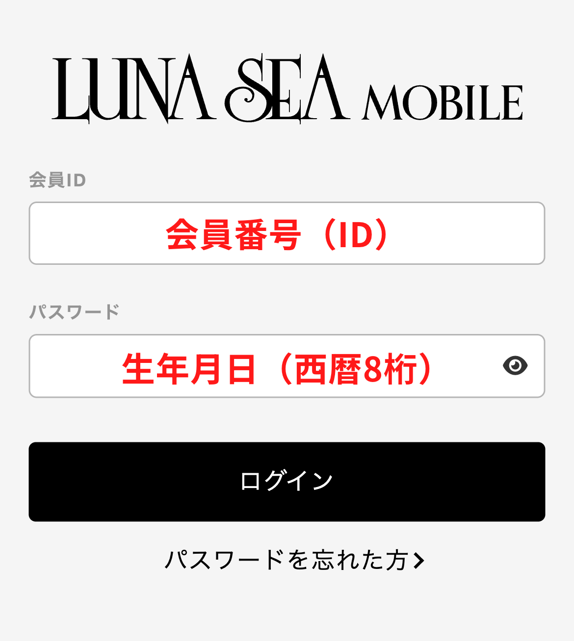 リニューアル前の「LUNA SEA MOBILE」でご登録されていた会員番号(ID)と生年月日(西暦8桁)でログイン -