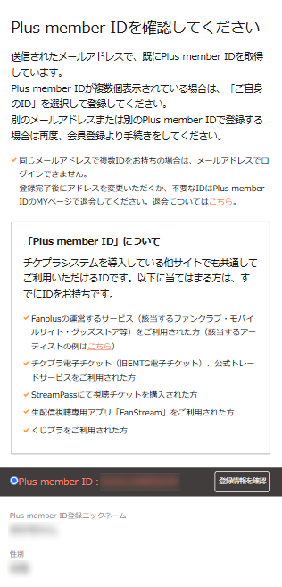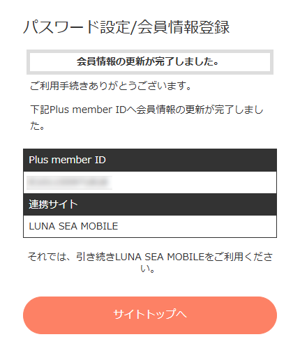 「LUNA SEA MOBILE」で登録されているアドレスで、Plus member IDをすでに取得されている場合は、取得済みのIDが表示されます。