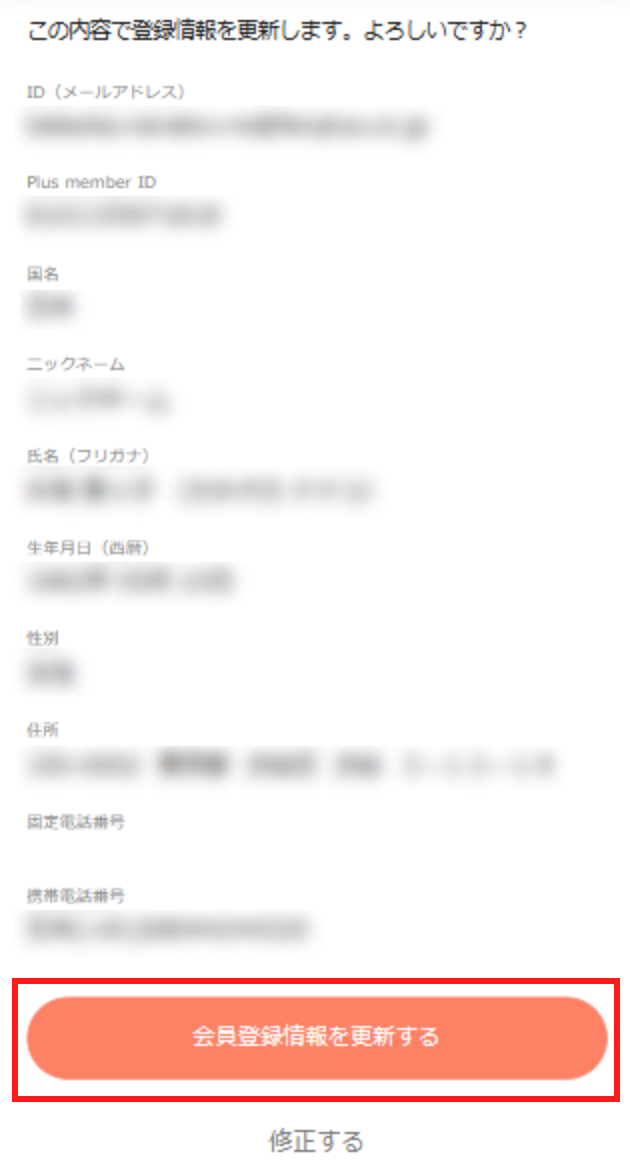 認証が完了しましたら、引き続き会員情報登録を行ってください。- すでにPlus member IDを取得されていた方で、住所や電話番号の情報が古い場合は、最新の情報に更新をお願いいたします。